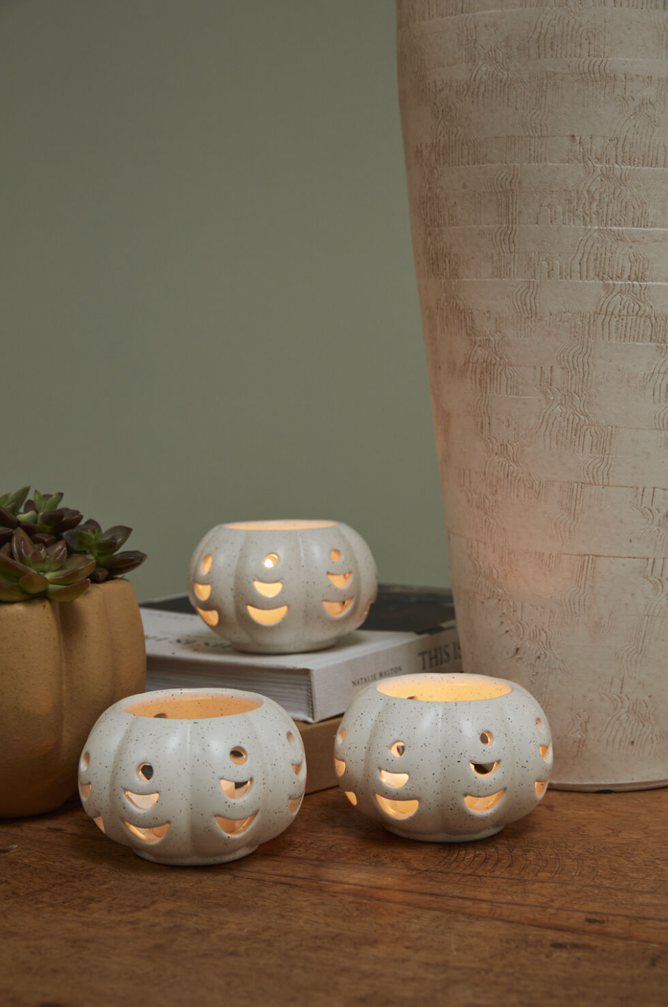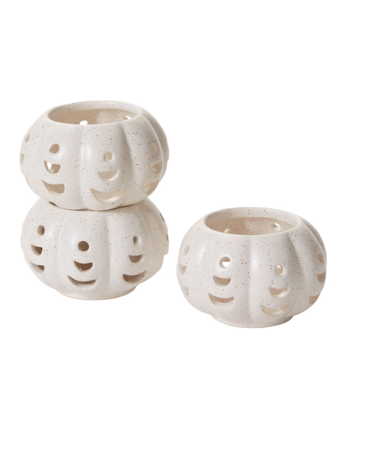 As artful as they are functional, the stackable set of 3 Pumpkin Stack Votive Set adds a little charm to spooky season. These hand painted ceramic identical votives feature crescent cutouts & a warm white speckled glaze, perfect for both Halloween & harvest. Stack them in a tower or style them separately around the home with a tealight or battery-operated candle to cast a warm autumn glo